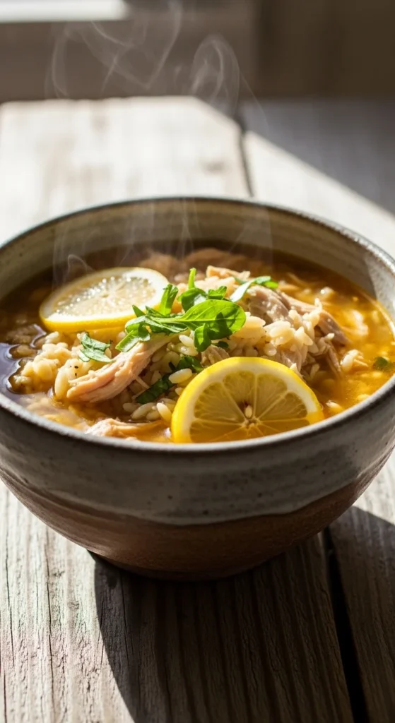 Cook chicken in broth with garlic and onion. Add orzo pasta and finish with lemon juice. Lemon makes it bright without heavy cream. Use leftover chicken or rotisserie scraps to save money. Add carrots or spinach if you have them.
