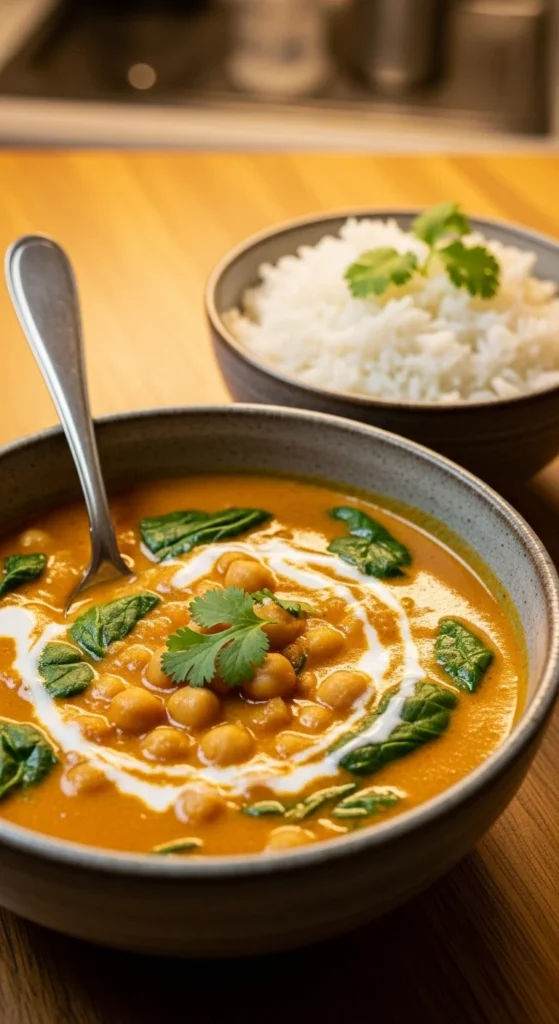 Cook chickpeas in broth with curry spices and spinach. Serve with rice. Pantry spices make it rich on a budget.