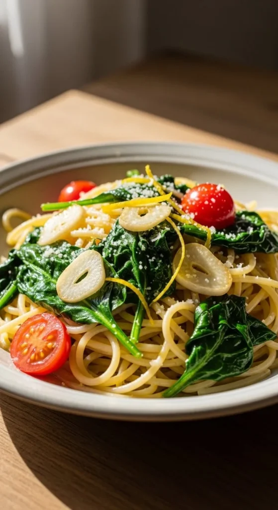 Cook pasta until just tender. Add spinach during the last minute so it wilts gently. Warm olive oil in a pan with sliced garlic. Toss everything together with lemon zest, salt, and pepper. Use any pasta shape you already have. Frozen spinach works if fresh costs more. Drain it well first. This meal cooks fast and stays light. Add a spoon of pasta water to keep things loose. Eat it as-is or with a small side salad. Leftovers reheat well with a splash of water.