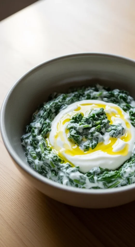 Wilt spinach in a pan. Cool slightly. Mix with plain yogurt, salt, and olive oil. Eat with bread. This bowl feels smooth and calming. Cottage cheese can replace yogurt. Add lemon if you like.
