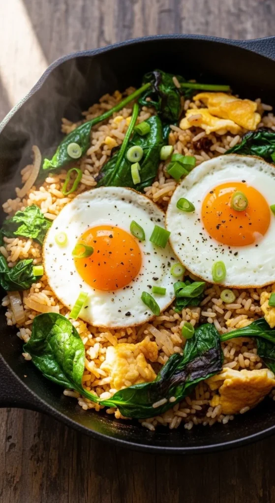 Use leftover rice. Heat oil, add spinach until wilted, then stir in rice and soy sauce. Crack an egg and mix through. This clears leftovers and cooks fast. Adjust portions easily.