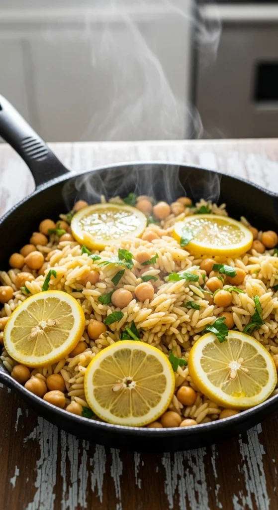 This dish comes together in one pan and fills the plate without feeling heavy. Orzo cooks fast and absorbs flavor well. Chickpeas add staying power and texture. Lemon juice sharpens the whole dish without sauce. Start with dry orzo, onion, and garlic. Toast them briefly. Add water or vegetable stock. Stir in canned chickpeas. Finish with lemon zest and juice.