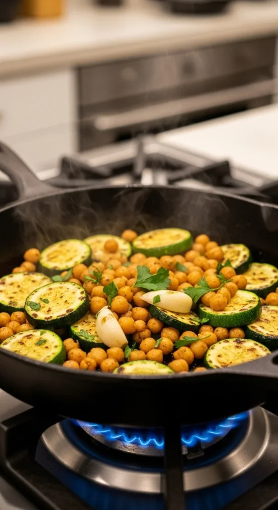Zucchini cooks fast. Chickpeas add structure. Sauté with garlic and soy sauce.