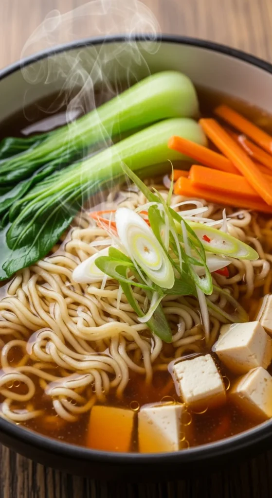 Use instant noodles without seasoning packets. Add broth, tofu, and vegetables.