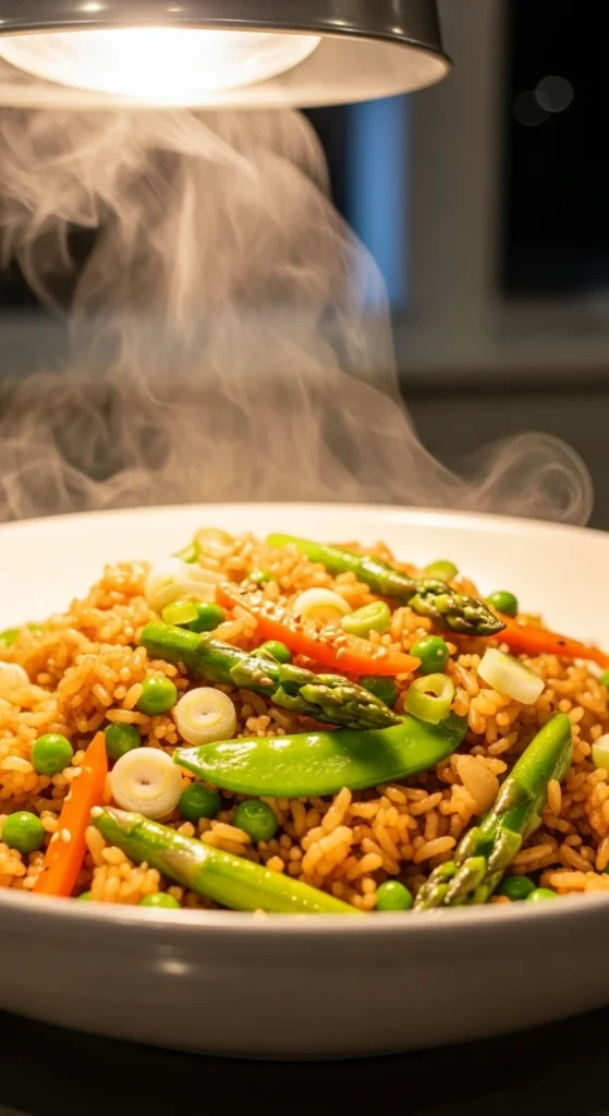 Fried rice works when the fridge feels empty. Cold rice is key. Use jasmine or long-grain rice cooked the day before. Heat oil in a pan. Add garlic and scallions. Toss in chopped spring vegetables like asparagus and carrots. Stir in rice and soy sauce.