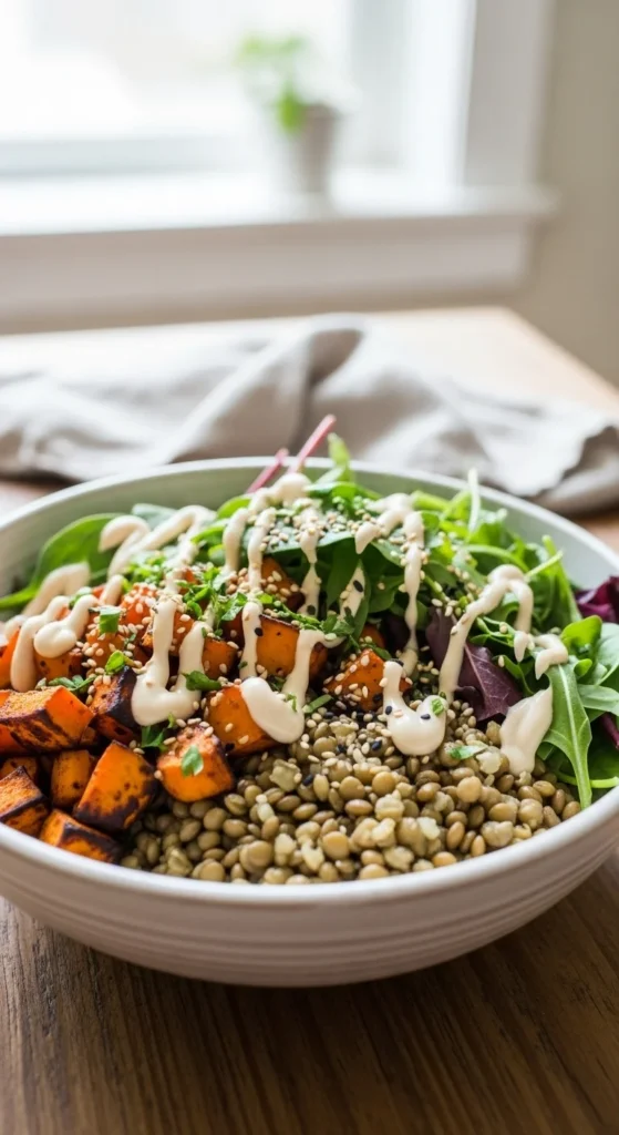 Serve over rice or quinoa if you have it. A quick tahini sauce with lemon and water ties it together. This bowl works warm or cold. Use canned lentils for speed. Swap sweet potatoes with carrots if needed.