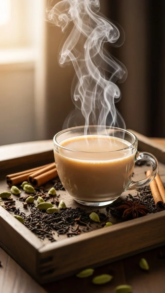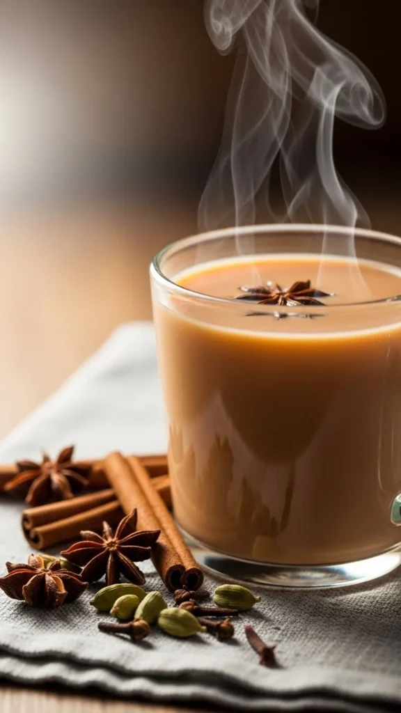 Brew strong tea, add milk, and stir in cinnamon or cardamom.