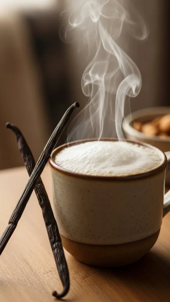An almond steamer tastes light and smooth. Heat almond milk and add a small splash of vanilla essence.