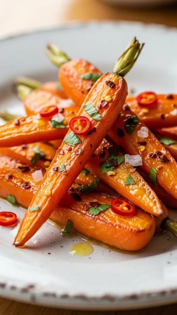 Spicy roasted carrots are warming with a hint of heat. Toss carrots with olive oil, chili flakes, salt, and pepper. Roast until tender. Budget-friendly: dried chili works well. Serve as a side or snack. Spices balance sweetness and create a dynamic, flavorful winter dish.