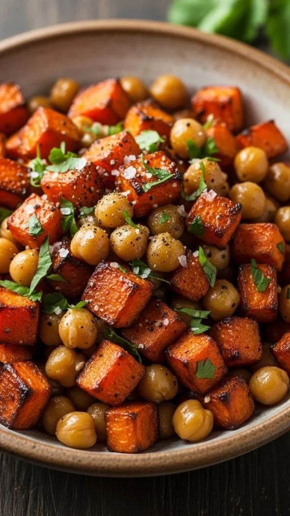 Carrot and chickpea roast is protein-rich and hearty. Toss carrots and chickpeas with olive oil, salt, pepper, and spices. Roast until golden and tender. Budget-friendly: canned chickpeas work fine. Serve as a side or main dish. Chickpeas add texture and substance while carrots provide natural sweetness.