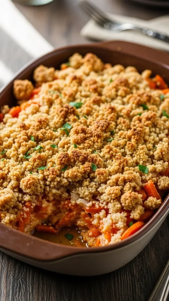 Carrot casserole is rich and comforting. Mix cooked carrots with butter, spices, and a topping of breadcrumbs or nuts. Bake until golden. Budget-friendly: use pantry staples and seasonal carrots. Serve as a side. Crunchy topping adds texture while baked carrots release natural sweetness.
