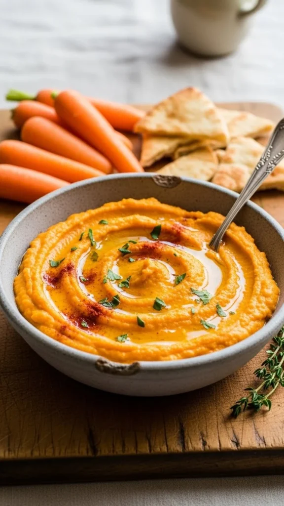 Roasted carrot hummus is creamy and flavorful. Roast carrots, then blend with chickpeas, tahini, lemon, and garlic. Budget-friendly: canned chickpeas work. Serve as a dip or spread. Roasting brings out sweetness and adds depth to traditional hummus.