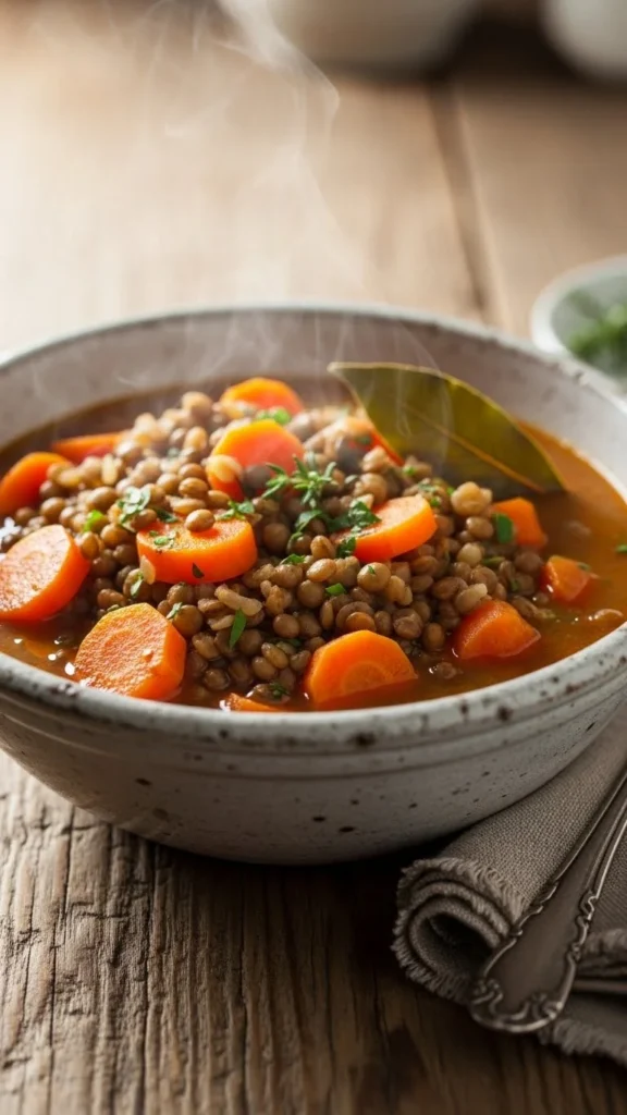 Carrot and lentil stew is filling and nutritious. Combine carrots, lentils, onions, garlic, and spices in broth. Simmer until tender. Budget-friendly: dried lentils and seasonal carrots reduce cost. Serve as a main or side dish. Lentils absorb flavors while carrots provide natural sweetness, making it a comforting winter option.