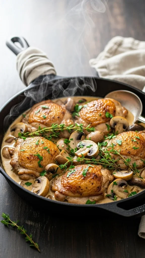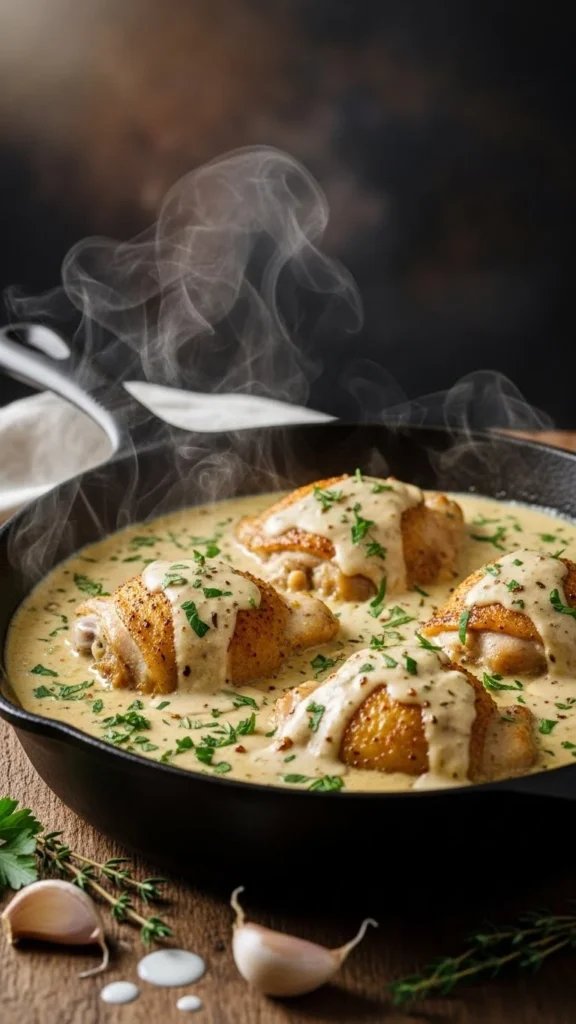 This skillet brings warmth to the table with very little work. Brown chicken thighs, then simmer with garlic, cream, and herbs. The sauce thickens naturally as it cooks.