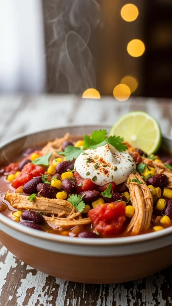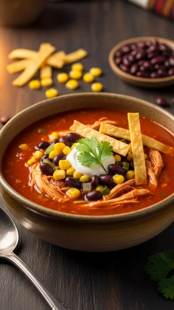 This soup adds warmth without heavy ingredients. Simmer shredded chicken with tomatoes, beans, broth, and mild spices.