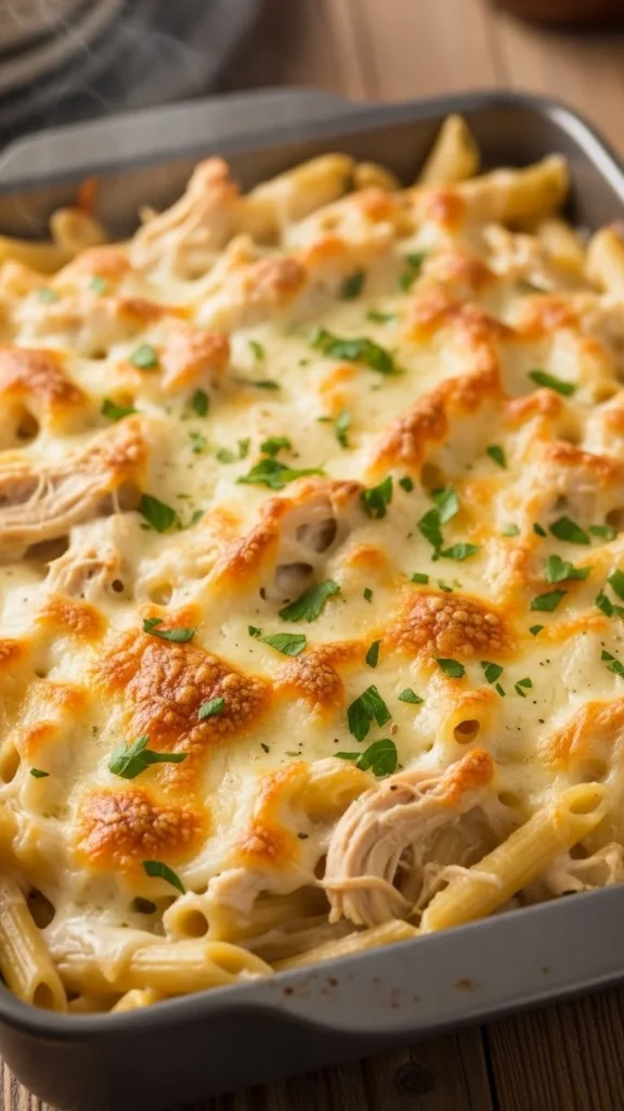 This bake combines pasta, chicken, and a creamy sauce into a family-friendly meal. Mix cooked pasta with alfredo sauce and shredded chicken. Add cheese on top and bake until golden.
