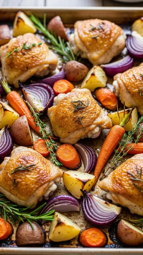 A single sheet pan handles the whole meal. Lay chicken thighs over chopped winter vegetables. Add oil, salt, pepper, and herbs. Roast until crisp.