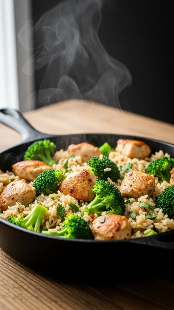 One skillet handles the full meal. Cook chicken pieces, then add rice, broth, and broccoli. Cover and simmer until the rice softens.