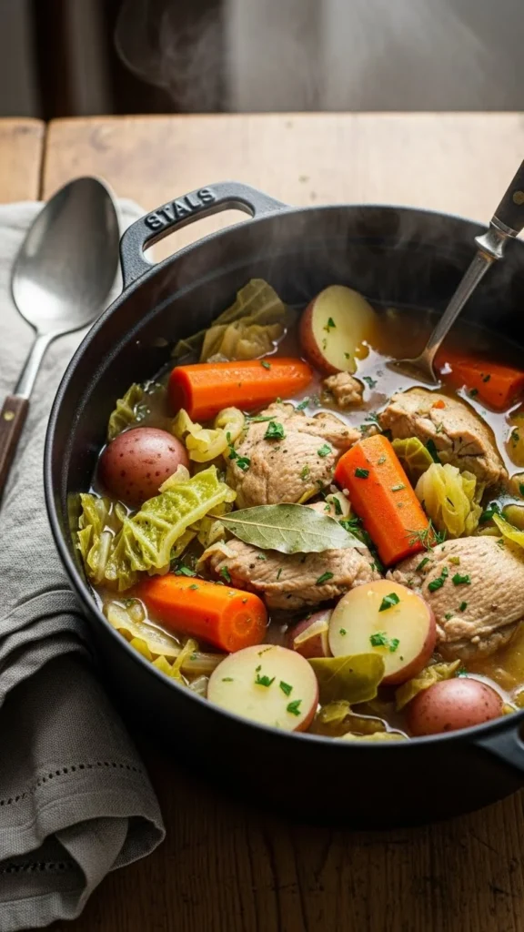 Cabbage softens beautifully in stew. Combine chicken pieces, cabbage, potatoes, carrots, and broth. Simmer slowly so everything turns tender.