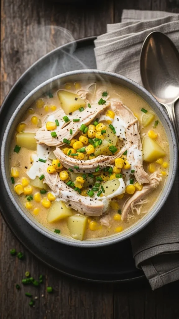 This chowder feels like a hug in a bowl. Simmer diced potatoes, onion, garlic, and broth until soft, then add shredded chicken and a little cream.