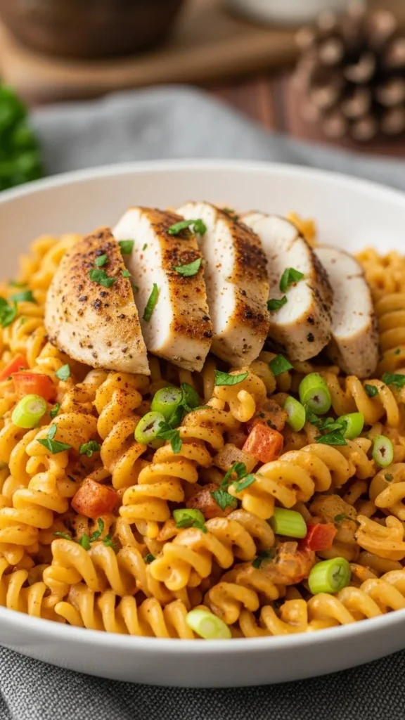 This pasta gives winter dinners a little colour while staying easy. Cook seasoned chicken, slice it, and stir into a creamy pasta sauce with garlic and a mild Cajun spice mix.