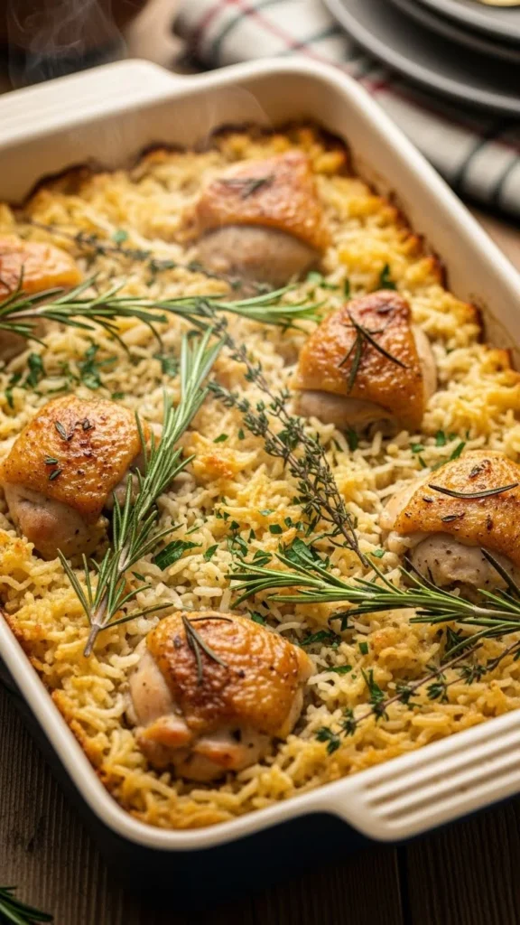 This bake handles itself once assembled. Mix rice, broth, garlic, and seasoning in a dish, then nestle chicken pieces on top. Cover and bake until everything softens.
