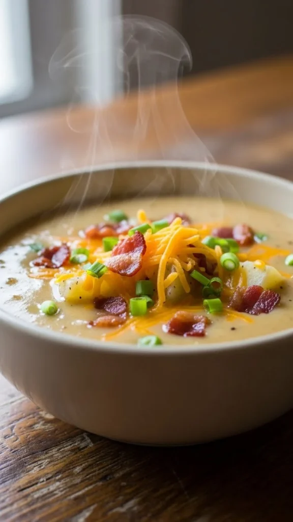 This soup feels like a bowl of winter comfort. Combine potatoes, broth, onions, and milk. Cook until the potatoes soften and thicken the soup naturally. Add cheese or sour cream for more richness. Top with bacon, green onions, or croutons. It’s simple to make in large batches and stays thick after chilling. Serve with bread or a small salad.