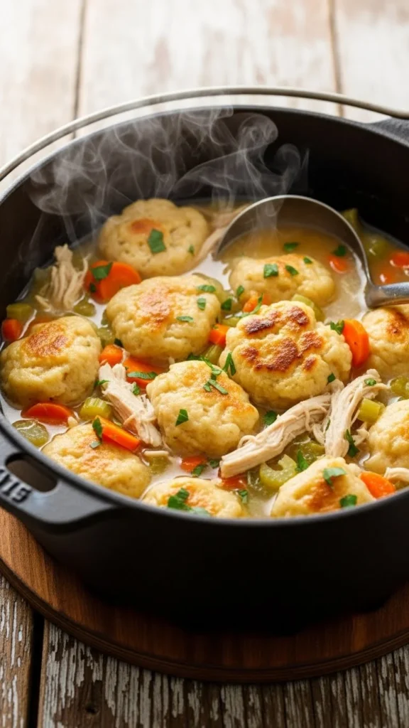 This dish cooks into a soft, cozy pot of comfort. Use chicken, broth, vegetables, and simple dumplings made from biscuit dough or flour and milk. Simmer everything until the dumplings puff and the broth thickens. Add peas or corn for extra texture. This meal works well for winter evenings and stretches easily for larger groups.