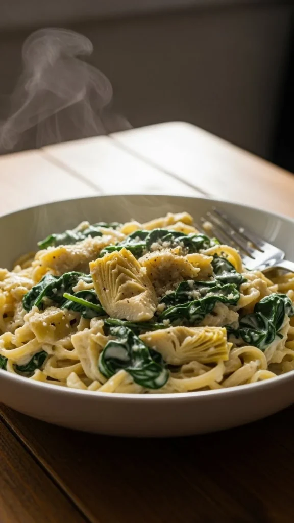 This pasta dish brings together a smooth sauce with tender vegetables. Mix cooked pasta with cream cheese, broth, garlic, spinach, and chopped artichokes. Let everything warm in the pan until the sauce clings to the noodles. Add parmesan for a thicker finish. Use canned artichokes to save cost and time. This meal works well on busy nights and creates leftovers that reheat smoothly. Serve with bread or roasted vegetables.