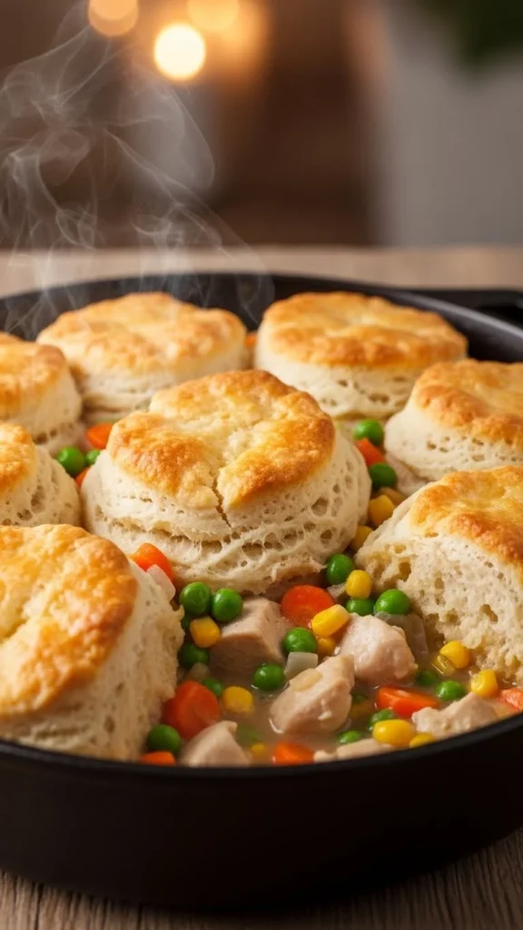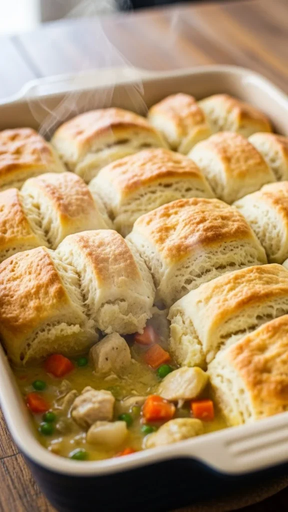 This recipe gives classic pot pie comfort without complicated steps. Use cooked chicken or vegetables, mix with a creamy base, and top with biscuits. Bake until golden. Frozen vegetables work well and save money. This dish is great for clearing out leftover meat or vegetables. Serve hot with a side salad or roasted greens.