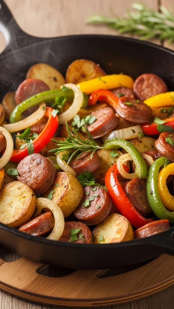 This skillet meal brings together potatoes, sausage, and vegetables into a warm winter breakfast or dinner. Dice potatoes and cook until browned. Add sausage and chopped peppers. Stir until everything softens. Top with cheese or eggs if you want a fuller meal. Use whatever vegetables you have on hand. This dish is flexible, affordable, and filling. It’s also great for leftover ingredients.