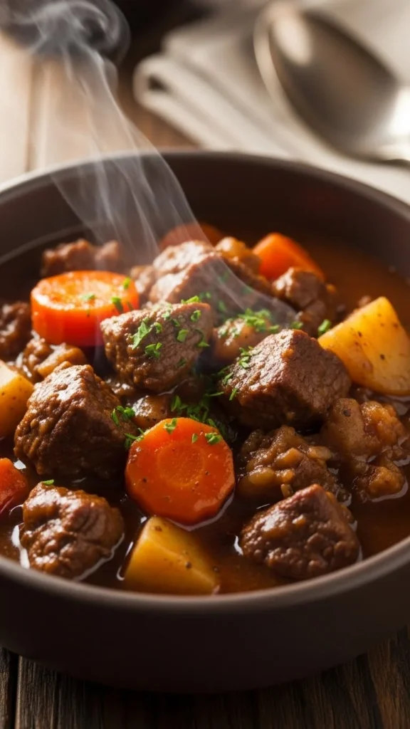 This stew settles into a thick, cozy bowl after a few hours of cooking. Brown the beef first for deeper flavor, then add potatoes, carrots, broth, and seasonings. Let it simmer until the vegetables soften and the broth thickens. Add peas at the end if you want more color. Serve with bread or rice. If you want to stretch it, add more potatoes. This meal works well for weekend cooking or batch prep.