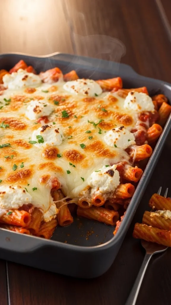 This pasta bake offers a warm, filling dinner. Mix cooked ziti with tomato sauce, mozzarella, and herbs. Bake until the top melts and the edges crisp. Add spinach or mushrooms if you want to increase the vegetables. Make a large batch when you want leftovers for busy nights. It’s easy to assemble and uses pantry ingredients.