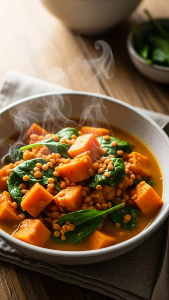 This curry brings colour and gentle heat to winter evenings. Cook onions and garlic, then add sweet potatoes, lentils, tomatoes, and light curry seasoning. Simmer until the lentils thicken the sauce and the sweet potatoes soften. Stir in spinach at the end. Serve with rice or warm naan. This dish is filling and affordable because lentils stretch far and cook quickly. Store leftovers for lunches—they hold texture well and reheat smoothly. Add a small spoon of yoghurt on top if you want a cooling contrast.