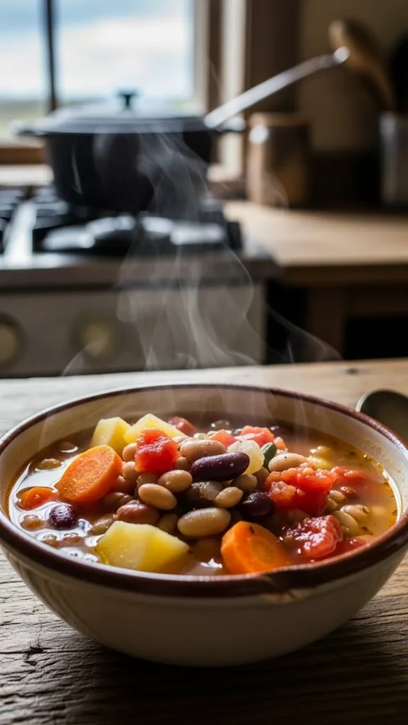 This soup uses simple ingredients but carries deep, cosy flavour. Add carrots, potatoes, onions, celery, tomatoes, and beans to a large pot. Simmer slowly until everything softens and the broth thickens. Use canned beans for convenience and affordability. Serve with bread for a complete dinner. This soup makes large batches without much cost and works well for families with mixed preferences. It stores well, freezes cleanly, and tastes even better the next day as the flavours settle.