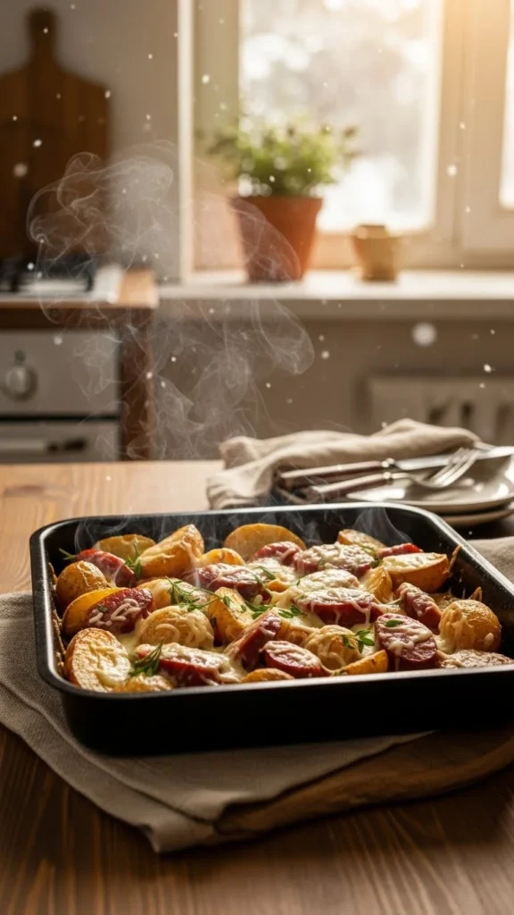 This bake offers hearty flavour without complicated steps. Toss sliced potatoes with sausage, onions, garlic, and seasoning. Bake until the potatoes soften and the sausage browns. Add cheese during the last few minutes for a warm, melty finish. Serve with a simple salad or steamed vegetables. This recipe uses affordable ingredients and works well for large families. Prep everything ahead and store it in the fridge until you’re ready to bake. Leftovers hold their texture and make an easy lunch the next day.