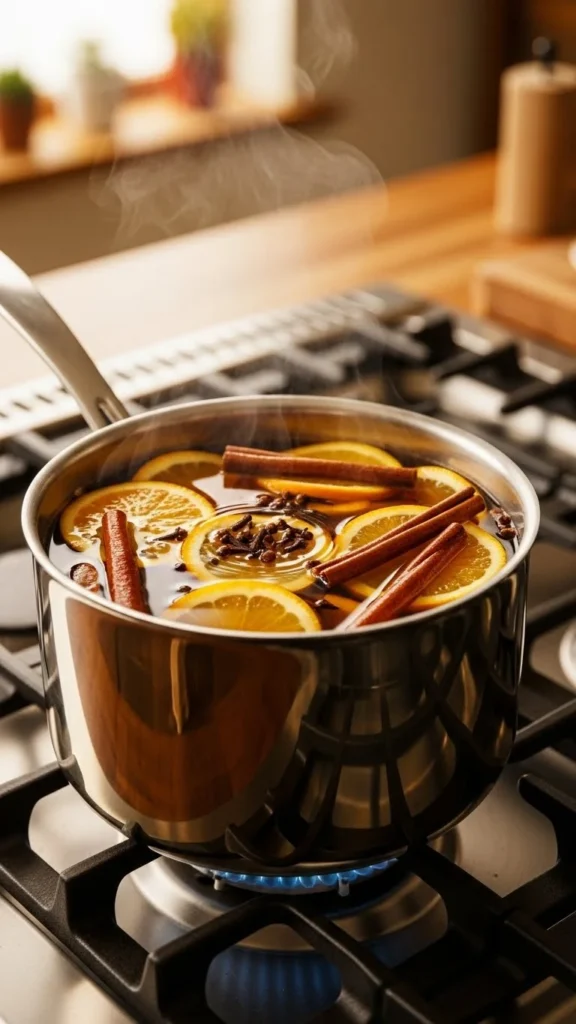 Pour apple cider into a pot and add cinnamon sticks, cloves, and orange slices. Simmer gently.