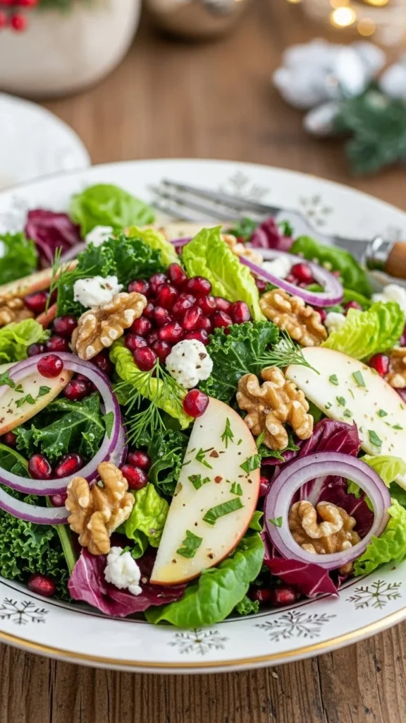 Toss greens with pomegranate, walnuts, olive oil, and vinegar. Budget-friendly: use seasonal fruits. This vibrant salad adds color and freshness to the table.
