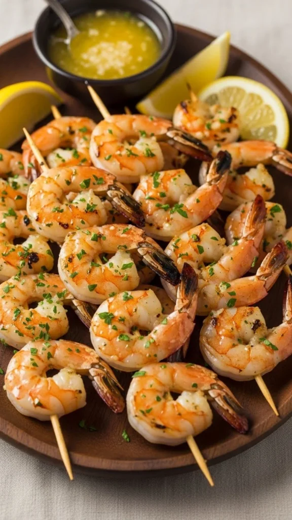 Marinate shrimp with garlic and butter, grill or bake. Budget-friendly: frozen shrimp is affordable. Serve as an appetizer or main. These skewers are quick, flavorful, and festive.