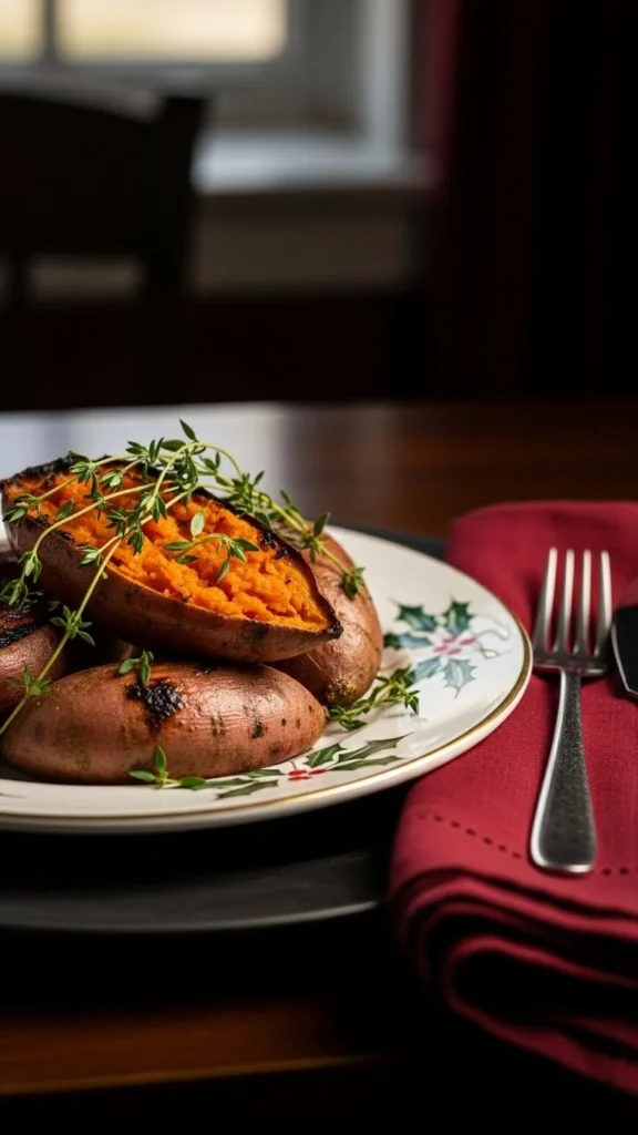Toss sweet potatoes with olive oil and thyme, roast until tender. Budget-friendly: local sweet potatoes are affordable. These savory-sweet potatoes are perfect for holiday tables.