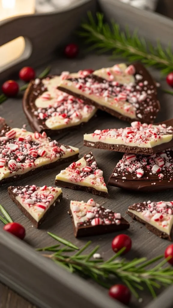 Melt chocolate, layer with crushed peppermint, chill until firm. Budget-friendly: use basic chocolate bars. This festive treat adds sweetness and holiday spirit.