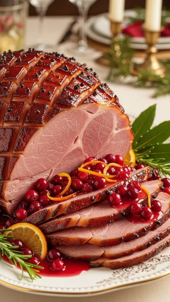Score ham, glaze with cranberry and orange sauce, and bake. Budget tip: smaller hams are economical. This sweet and tangy ham is visually stunning and flavorful.
