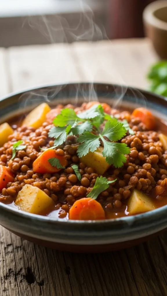 A lentil vegetable stew works well for cold nights because it cooks in one pot and feels warm all the way through. Use dry lentils to save money and stretch the recipe. Add chopped carrots, celery, and potatoes for extra thickness. Let everything simmer slowly so the flavours settle. You can keep this gluten-free by skipping packaged mixes and using herbs from your pantry. Freeze portions in jars for quick meals during busy weeks. Add spinach at the end for colour. Serve with gluten-free bread or rice for a full meal.
