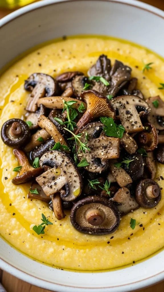 Polenta becomes smooth and comforting when cooked slowly with broth and a little butter. Top with mushrooms browned in a pan. This meal feels warm and grounding on cold evenings. Buy polenta in bulk to save money. Add herbs or garlic if you want more flavour. Serve alone or with greens. Leftovers firm up, so slice and pan-fry them the next day.