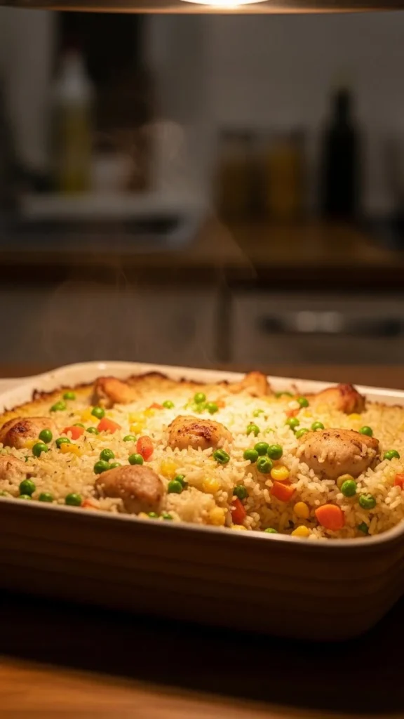 A rice bake keeps dinner simple because everything cooks in one dish. Mix rice, broth, vegetables, and chicken pieces. Add seasoning and bake until tender. This recipe stays gluten-free as long as you check the broth label. Use frozen vegetables to cut costs. Leftovers taste great warmed up the next day.