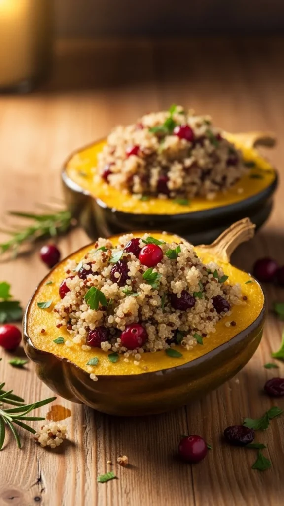 Acorn squash holds fillings beautifully. Bake the halves until soft, then stuff them with quinoa, cranberries, and nuts. Add herbs for aroma. This dish looks impressive but stays simple. Use leftover quinoa from another meal to save time. Each half becomes a full serving, making plating easy.