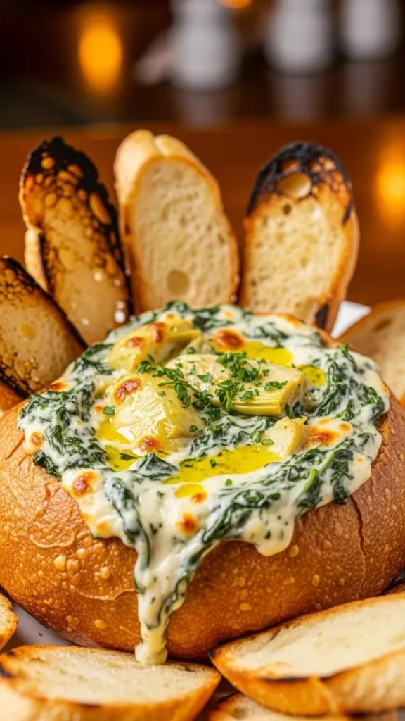Combine spinach, artichokes, cream cheese, and bake until bubbly. Budget-friendly: use frozen spinach and canned artichokes. This creamy dip is perfect as an appetizer for guests.