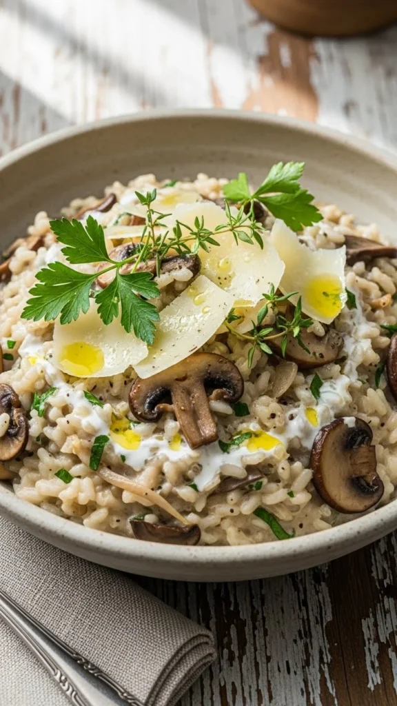 Cook arborio rice slowly with broth and mushrooms, finish with cheese. Budget-friendly: use locally sourced mushrooms. This luxurious side is perfect for winter dinners.