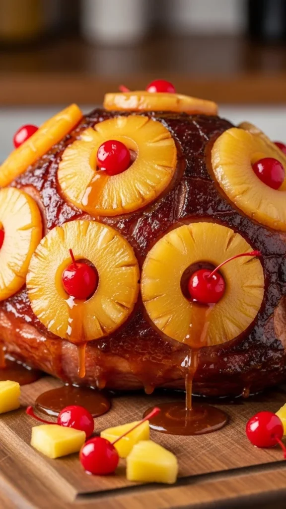 Score ham, brush with glaze, top with pineapple, and bake. Budget-friendly: small hams work well. This sweet-savory main is festive and crowd-pleasing.
