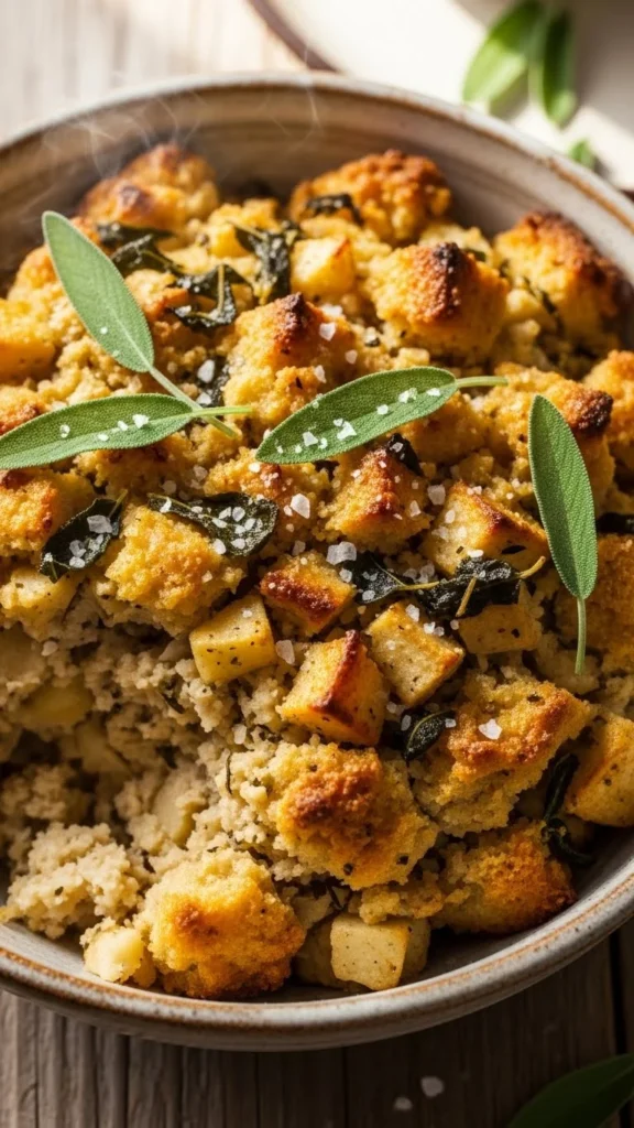 Combine bread cubes, apples, and herbs, bake until golden. Budget-friendly: use day-old bread. This savory-sweet stuffing is a holiday staple.